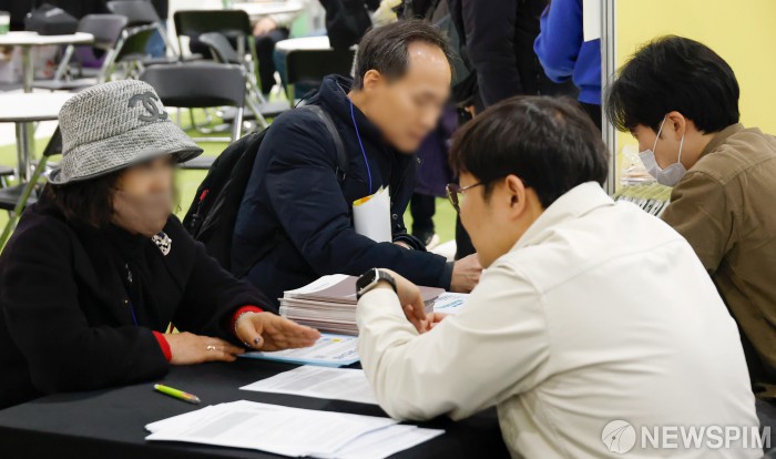 [서울=뉴스핌] 류기찬 기자 = 18일 오전 서울 강남구 세텍 서울무역전시장에서 열린 ‘서울 시니어 일자리 박람회 2025'를 찾은 구직자들이 취업상담을 받고 있다. 2025.11.18 ryuchan0925@newspim.com