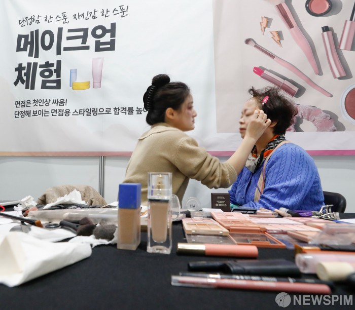 [서울=뉴스핌] 류기찬 기자 = 18일 오전 서울 강남구 세텍 서울무역전시장에서 열린 ‘서울 시니어 일자리 박람회 2025'를 찾은 한 구직자가 메이크업 체험을 하고 있다. 2025.11.18 ryuchan0925@newspim.com