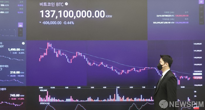 [서울=뉴스핌] 양윤모 기자 = 가상화폐 시가총액 1위 비트코인이 급락한 18일 서울 강남구 업비트 고객센터 전광판에 비트코인 거래 가격이 1억3천7백만원대로 표시되고 있다. 글로벌 가상자산 플랫폼 코인마켓캡에서 비트코인은 전일(24시간 전) 대비 3.02% 하락한 9만 1953달러에 거래 중이다. 비트코인 가격이 9만2000달러 선마저 붕괴하며 지난 4월 이후 최저 수준으로 추락했다. 2025.11.18 yym58@newspim.com
