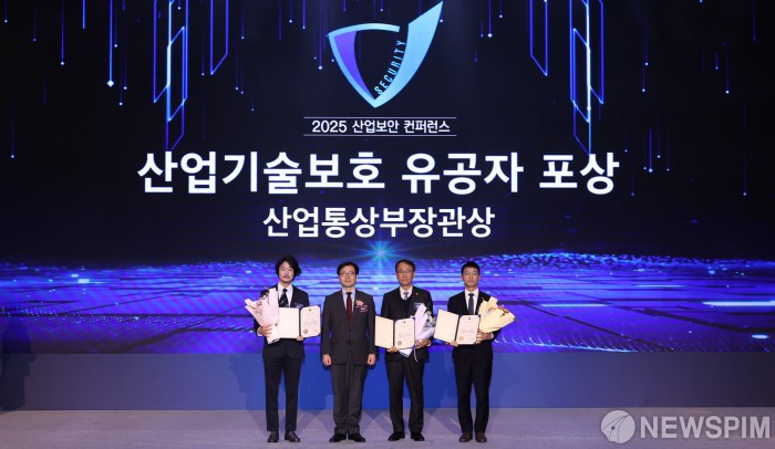 [서울=뉴스핌] 여한구 산업통상부 통상교섭본부장이 18일 서울 강남구 그랜드 인터컨티넨탈 서울 파르나스에서 열린 제15회 산업기술보호의 날 및 2025 산업보안 컨퍼런스에서 '산업기술보호 유공자 포상' 산업통상부장관상 수상자들과 기념촬영을 하고 있다. [사진=산업통상부] 2025.11.18 photo@newspim.com