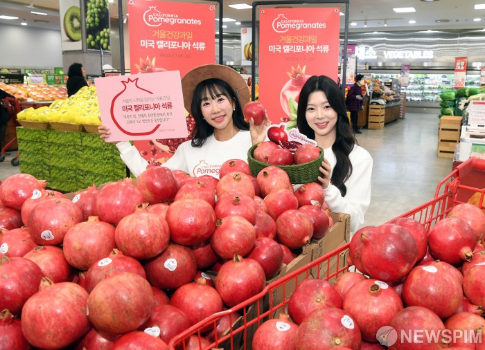 [서울=뉴스핌] 양윤모 기자 = 18일 서울 롯데마트 제타플렉스 서울역점에서 열린 '미국 캘리포니아 석류' 출시 행사에서 모델들이 홍보하고 있다. 천혜의 자연환경을 갖춘 캘리포니아에서 주로 생산되는 미국석류는 색깔이 진하고 과육이 크고 단단하며 과피가 팽팽한 것이 특징이다. 이번주 목요일(20일)부터 롯데마트 전 매장에서 미국산 석류 특대사이즈를 4,990원에 행사가로 구입할 수 있다. [사진=미국석류협회] 2025.11.18 yym58@newspim.com