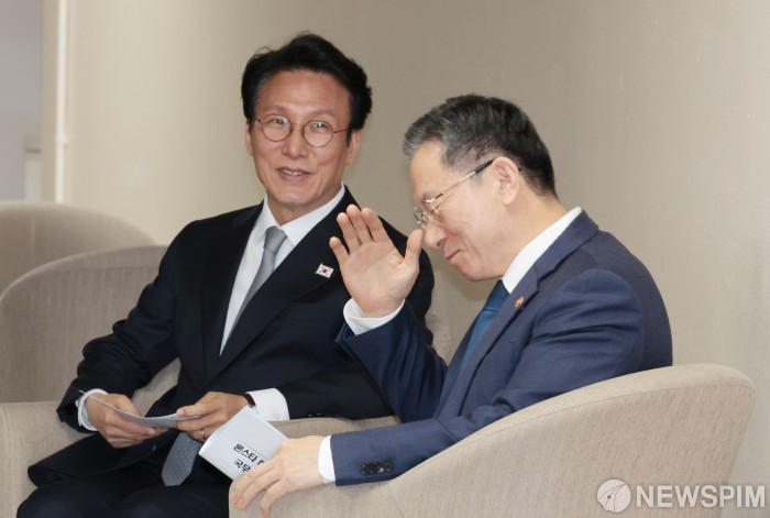 [서울=뉴스핌] 이길동 기자 = 김민석 국무총리와 정성호 법무부 장관이 18일 서울 종로구 정부서울청사에서 열린 론스타 ISDS 취소신청' 관련 긴급 브리핑에 앞서 이야기를 나누고 있다. 이날 브리핑에서 정부는 오늘 오후 3시 22분경 미국 동부 시간으로는 새벽 1시 22분경에 미국 워싱턴 D.C.에 있는 국제투자분쟁해결센터(ICSID)의 론스타 ISDS 취소위원회로부터 대한민국 승소 결정을 선고받았다고 발표 했다.2025.11.18 gdlee@newspim.com