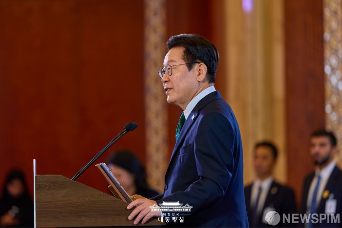 [서울=뉴스핌] 아랍에미리트(UAE)를 국빈 방문 중인 이재명 대통령이 지난 17일(현지시간) 저녁 아부다비 한 호텔에서 열린 동포 한국 기업인 만찬 간담회에서 인사말을 하고 있다. [사진=대통령실] 2025.11.19 photo@newspim.com
