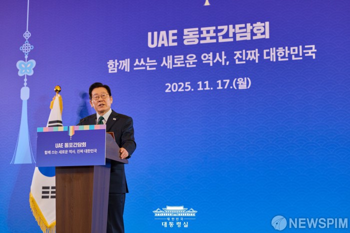 [서울=뉴스핌] 아랍에미리트(UAE)를 국빈 방문 중인 이재명 대통령이 지난 17일(현지시간) 저녁 아부다비 한 호텔에서 열린 동포 한국 기업인 만찬 간담회에서 인사말을 하고 있다. [사진=대통령실] 2025.11.19 photo@newspim.com