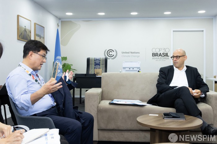 [서울=뉴스핌] 김성환 기후에너지환경부 장관이 18일(현지시간) 브라질 벨렝에서 열린 제30차 유엔기후변화협약당사국총회(COP30)에 참석해 사이먼 스틸 유엔기후변화협약(UNFCCC) 사무총장과 2035 국가온실가스감축목표를 논의하고 대한민국의 2026년 기후주간 유치 지원을 요청하고 있다. [사진=기후에너지환경부] 2025.11.19 photo@newspim.com