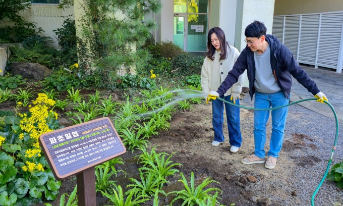| 금호석유화학그룹 직원들이 금호제주리조트에 식재한 파초일엽에 물을 주고 있는 모습 [사진=금호석유화학] |