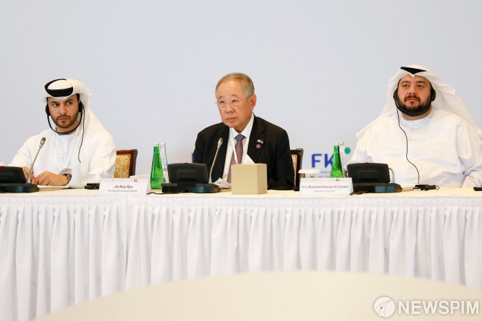 [서울=뉴스핌] 류진 한국경제인협회 회장이 19일(현지시간) 아부다비 에미레이트 팰리스 호텔에서 열린 '한-UAE 비즈니스 라운드테이블'에 참석해 인사말을 하고 있다. [사진=한국경제인협회] 2025.11.19 photo@newspim.com