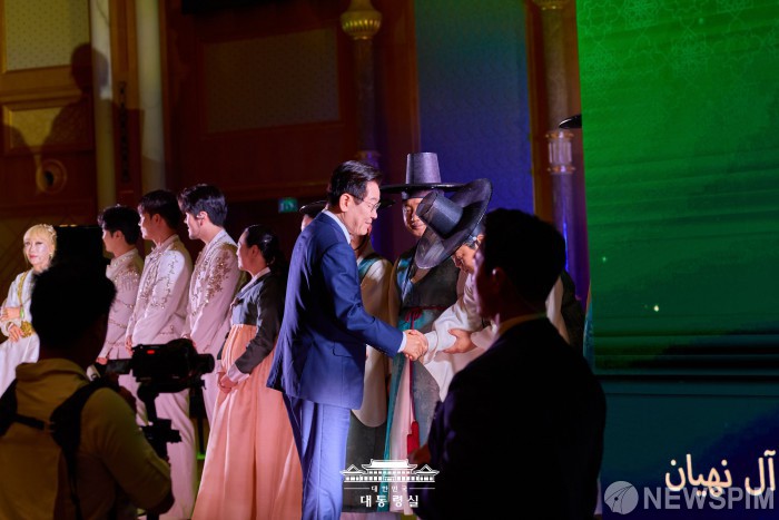 [서울=뉴스핌] 아랍에미리트를 국빈 방문 중인 이재명 대통령이 지난 18일(현지시간) 아부다비 대통령궁에서 열린 양국 문화교류 행사에서 출연진과 인사를 나누고 있다. [사진=대통령실] 2025.11.20 photo@newspim.com