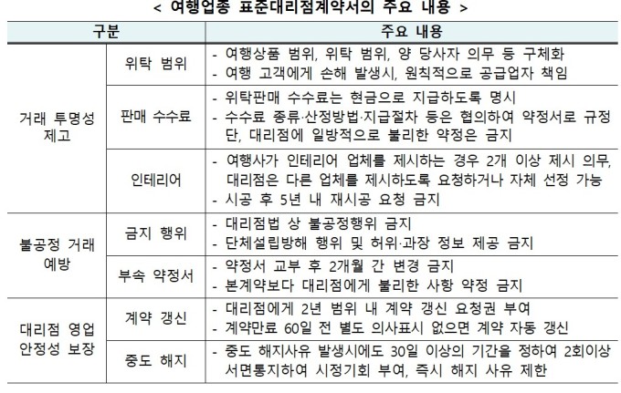 [세종=뉴스핌] 김범주 기자 = 공정거래위원회는 여행상품을 기획해 공급하는 '여행사'와 여행상품 판매업무를 위탁받아 수행하는 '대리점' 간 거래를 위한 표준계약서를 제정했다고 20일 밝혔다.