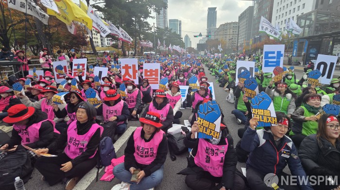 [서울=뉴스핌] 양윤모 기자 =학교에서 급식과 돌봄을 담당하는 비정규직 노동자들이 20일 오후 서울 여의도 국회의사당 앞에서 총파업 대회를 열고 기본급 인상과 방학 중 비근무자 생계대책 마련 등을 촉구하고 있다. 파업 첫날 지역의 교육 당국은 학교별로 빵과 우유 등으로 대체 급식을 실시 했다. 2025.11.20 yym58@newspim.com