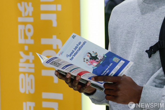 [서울=뉴스핌] 류기찬 기자 = 20일 오후 서울 강남구 세텍 서울무역전시장에서 열린 ‘외국인 취업·채용 박람회'에서 한 구직자가 안내책자를 읽고 있다. 2025.11.20 ryuchan0925@newspim.com