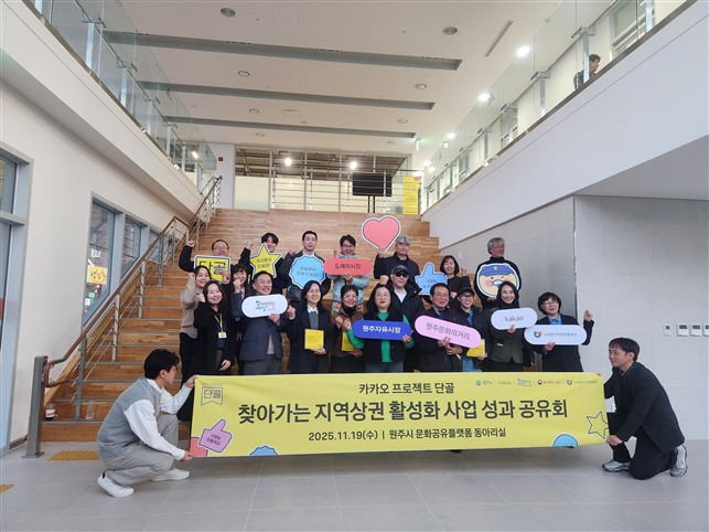 [원주=뉴스핌] 이형섭 기자 = 강원 원주시는 지난 19일 중앙동 문화공유플랫폼에서 '찾아가는 지역상권 활성화 사업' 성과 공유회를 열었다고 밝혔다. 이날 참여한 기업과 단체 등은 ㈜카카오, (사)함께만드는세상, 소상공인시장진흥공단, 도래미시장상인회, 자유시장번영회, 문화의거리상인회 등이다.