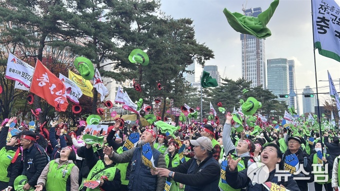 [서울=뉴스핌] 황혜영 인턴기자 = 형형색색 조끼를 입은 학교비정규직 노동자들이 국회 앞 도로 한가운데 모여들었다. 손에 든 피켓에는 '집단임금교섭 승리!', '차별을 끝내자!'라는 문구가 빼곡했다. 머리에 두른 띠에는 '단결투쟁', '파업 승리'다. '임금교섭 승리하자'는 개회 선언이 차가운 바람을 가르며 힘차게 울렸다. 곳곳에서는 "투쟁!"이라는 외침과 짧은 박수가 동시에 터져 나왔다.