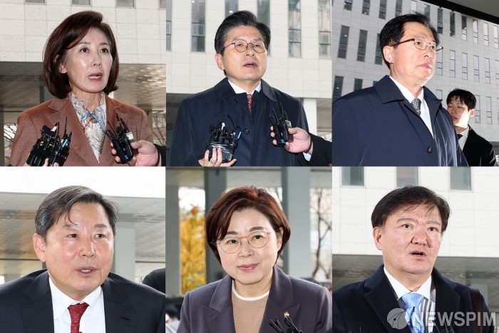 [서울=뉴스핌] 최지환 기자 = 나경원 국민의힘 의원(윗줄 왼쪽부터), 황교안 전 자유한국당 대표, 이만희·이철규(아랫줄 왼쪽부터)·김정재 국민의힘 의원, 민경욱 전 의원이 20일 오후 서울 양천구 서울남부지방법원에서 열린 '국회 패스트트랙(신속처리안건) 충돌 사건' 관련 1심 선고 공판에 출석하며 취재진 질문에 답변하고 있다. 2025.11.20 choipix16@newspim.com