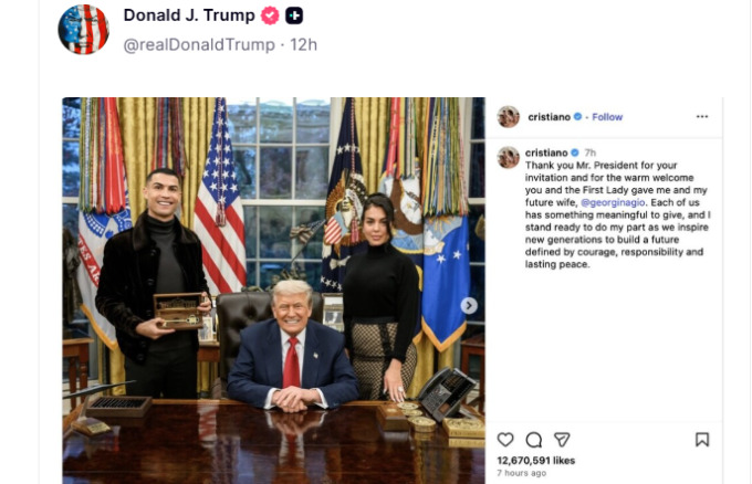 트럼프 대통령은 호날두와 함께 백악관 집무실인 오벌 오피스에서 공을 차는 모습을 담은, AI(인공지능) 합성으로 추정되는 짧은 동영상도 함께 올렸다. 또 호날두가 약혼녀와 함께 백악관을 방문해 찍은 사진과 감사 인사를 남긴 글도 캡처해 트루스소셜에 게시했다.