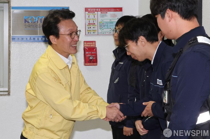 [서울=뉴스핌] 청사사진기자단 = 동절기 해양안전사고 예방 현장점검에 나선 김민석 국무총리가 21일 오전 인천 중구 인천연안여객터미널 운항관리센터를 방문해 관계자들을 격려하고 있다. 2025.11.21 photo@newspim.com