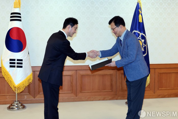 [서울=뉴스핌] 이길동 기자 = 윤창렬 국무조정실장(왼쪽)이 21일 오전 서울 종로구 정부서울청사에서 열린 헌법존중 정부혁신TF 자문단 위촉식에서 윤태범 방송통신대 행정학과 교수에게 위촉장을 수여하고 있다. 2025.11.21 gdlee@newspim.com