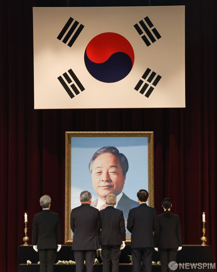 [서울=뉴스핌] 류기찬 기자 = 21일 오전 서울 동작구 국립서울현충원 현충관에서 열린 고(故) 김영삼 전 대통령 서거 10주기 추모식에서 참석자들이 헌화 및 묵념을 하고 있다. 2025.11.21 ryuchan0925@newspim.com