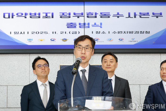 [수원=뉴스핌] 류기찬 기자 = 신준호 합수본부장 직무대행이 21일 오후 경기 수원시 영통구 수원지방검찰청에서 열린 ‘마약범죄 정부합동수사본부 출범식’에서 축사를 하고 있다. 2025.11.21 ryuchan0925@newspim.com