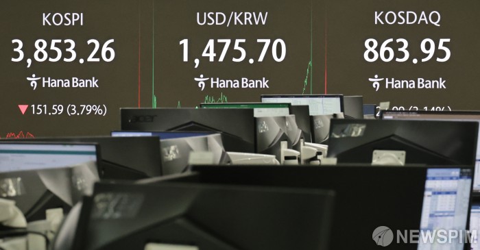 [서울=뉴스핌] 양윤모 기자 = 뉴욕증시가 인공지능(AI) 관련주 거품 우려 지속에 약세로 마감한 가운데, 21일 오후 코스피가 전장 종가보다 151.59 포인트(3.79%) 하락하며 3853.26으로, 코스닥은 27.99 포인트(3.14%) 하락한 863.95로 장을 마감한 가운데, 서울 중구 하나은행 딜링룸에서 직원들이 업무를 보고 있다. 서울외환시장에서 달러/원 환율은 전장 대비 7.80원 상승한 1475.70원에 주간거래를 마감했다. 2025.11.21 yym58@newspim.com