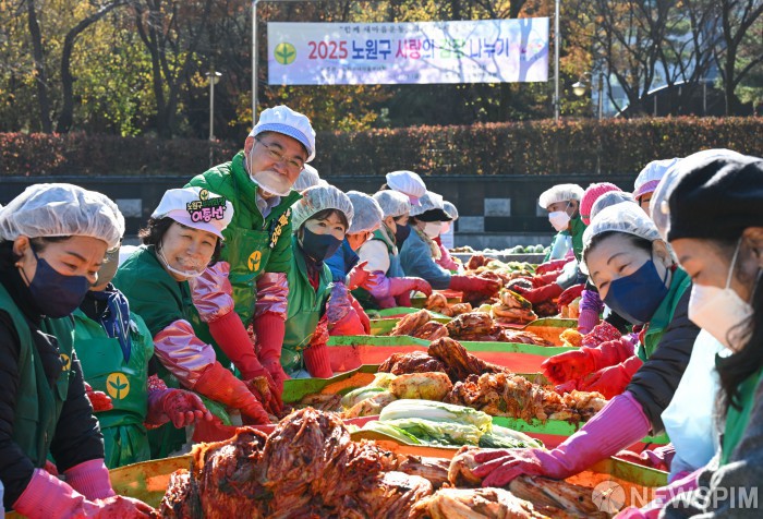 [서울=뉴스핌] 양윤모 기자 = 오승록 노원구청장이 21일 오전, 중계근린공원에서 열린 '2025 사랑의 김장나누기’ 행사에 참석해 노원구 새마을부녀회와 함께 김장김치를 담그고 있다. '사랑의 김장 나누기 행사'는 지역 내 다문화가정과 저소득 계층 가구에 김장김치를 지원하기 위해 마련된 것으로, 20일부터 21일까지 이틀간 진행됐다. 이날 현장에서 담근 김장 김치는 총 400박스(각 9kg)로 독거 어르신, 장애인 세대, 다문화가정 등에 전달될 예정이다. [사진=노원구청 ] 2025.11.21 yym58@newspim.com