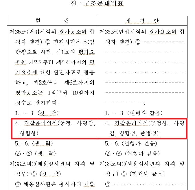 24일 뉴스핌 취재에 따르면 경찰청은 채용 면접 평가 기준에 올해부터 삭제됐던 '준법성'을 이르면 내년에 다시 추가하는 방안을 지난 14일 입법예고했다.