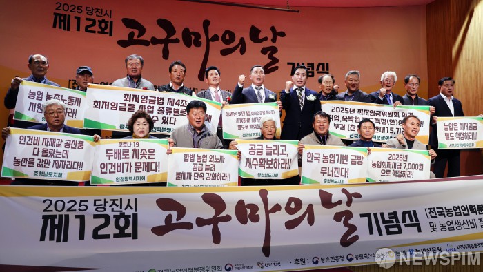 [서울=뉴스핌] 양윤모 기자 = 21일 오후 충남 당진시 농업기술센터 대강당에서 (사)한국고구마산업중앙연합회 (회장 이은규) 주최로 열린 '제 12회고구마의 날'기념식 행사에서 신승호 전국농업인력분쟁위원장과 각 시도위원들이 '농업 외국인 인력 최저임금 별도 책정'을 요구하는 구호를 외치고 있다. [사진=(사)한국고구마산업중앙연합회 ] 2025.11.21 yym58@newspim.com