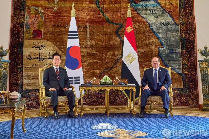 [서울=뉴스핌] 이집트를 공식 방문 중인 이재명 대통령이 지난 20일(현지시간) 카이로 대통령궁에서 압델 파타 알시시 대통령과 한-이집트 정상회담 기념촬영을 하고 있다. [사진=대통령실] 2025.11.21 photo@newspim.com