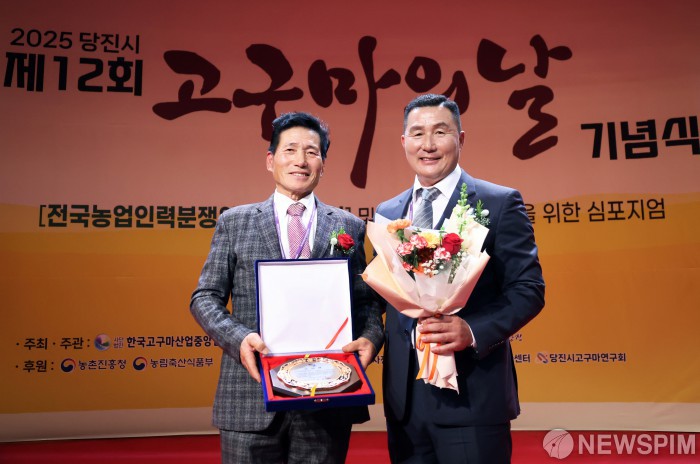 [서울=뉴스핌] 양윤모 기자 = 21일 오후 충남 당진시 농업기술센터 대강당에서 (사)한국고구마산업중앙연합회(회장 이은규) 주최로 열린 '제 12회고구마의 날'기념식 행사에서 이은규 회장(사진 오른쪽)이 남궁영철 한국고구마산업중앙연합회 인천시지회장에게 국회 농림축산식품 해양수산위원회 위원장 상을 시상하고 있다. [사진=(사)한국고구마산업중앙연합회] 2025.11.22 yym58@newspim.com