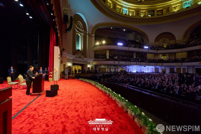 [서울=뉴스핌] 이재명 대통령이 지난 20일(현지시간) 이집트 카이로대학교에서 중동과 한반도가 함께 나아갈 미래 비전으로 'SHINE 이니셔티브'를 공식 제안하는 연설을 하고 있다. [사진=대통령실] 2025.11.22 photo@newspim.com