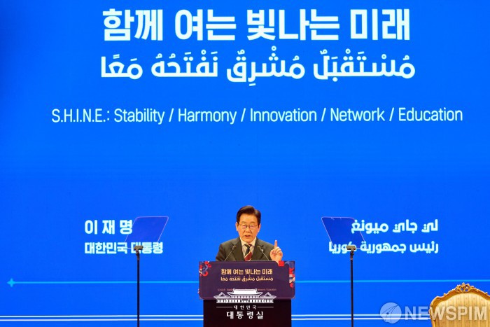 [서울=뉴스핌] 이재명 대통령이 지난 20일(현지시간) 이집트 카이로대학교에서 중동과 한반도가 함께 나아갈 미래 비전으로 'SHINE 이니셔티브'를 공식 제안하는 연설을 하고 있다. [사진=대통령실] 2025.11.22 photo@newspim.com