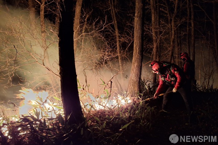 [서울=뉴스핌] 22일 오후 6시 26분경 강원도 양양군 서면 일대에 산불이 발생했다. 산림당국이 산불진화차량과 진화인력을 투입해 산불을 진압하고 있다. [사진=산림청] 2025.11.22 photo@newspim.com