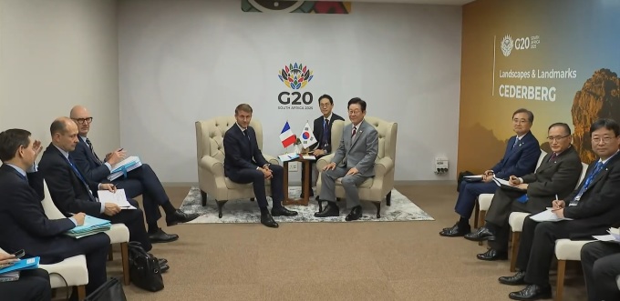 | 이재명 대통령과 에마뉘엘 마크롱 프랑스 대통령이 22일(현지시간) 오후 남아프리카공화국 요하네스버그에서 개최된 주요 20개국(G20) 정상회의 참석을 계기로 첫 정상회담을 하고 있다. [사진=KTV] |