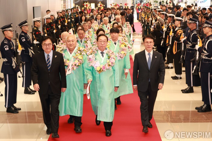 [서울=뉴스핌] 김학선 기자 = 우원식 국회의장과 김민석 국무총리가 23일 서울 강서구 김포공항 국제선 청사 입국장에서 열린 '광복80년 대한민국임시정부 요인 환국 재현' 행사에서 임시정부 요인 후손과 도열한 의장대를 사열하고 있다. 2025.11.23 yooksa@newspim.com
