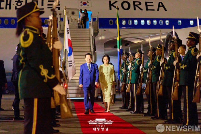 [서울=뉴스핌] 주요 20개국(G20) 정상회의에 참석하는 이재명 대통령이 김혜경 여사와 함께 지난 21일(현지시간) 남아프리카공화국 요하네스버그 OR탐보국제공항에 도착한 뒤 공군 1호기에서 내려 이동하고 있다. [사진=대통령실] 2025.11.23 photo@newspim.com