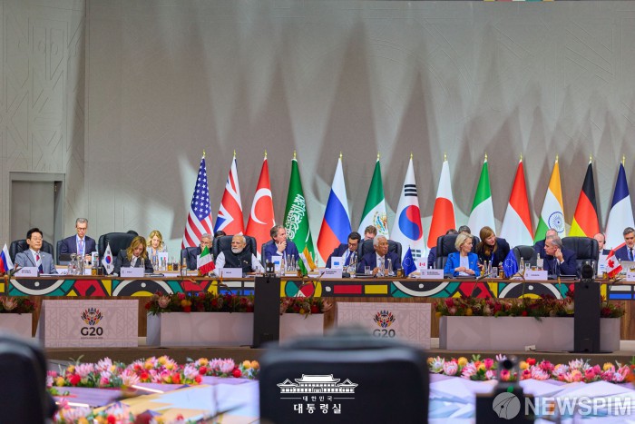 [서울=뉴스핌] 이재명 대통령이 지난 22일(현지시간) 남아프리카공화국 요하네스버그에서 열린 주요 20개국(G20) 정상회의 1세션에 자리하고 있다. [사진=대통령실] 2025.11.23 photo@newspim.com