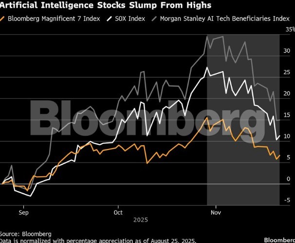 엔비디아를 넘어서, 다른 반도체 기업들도 월가가 AI 지출의 지속성에 의문을 제기하면서 갑자기 고전하고 있다. 칩 관련 주식 지수는 11월 들어 11% 하락해 2022년 이후 최악의 월간 실적을 기록할 전망이다. 어드밴스드 마이크로 디바이시스와 암 홀딩스 같은 기업들은 20% 넘게 하락했다.