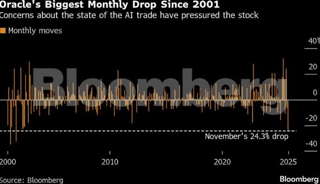 심각한 균열이 나타나기 시작하는 곳이 바로 거기다. 메타 주가는 10월 29일 실적 발표 이후 21% 하락했다. 투자자들이 공격적인 자본적지출 계획에 대해 우려하면서다. 마이크로소프트는 같은 날 실적 이후 비슷한 이유로 13% 하락했다. 대차대조표가 더 약한 기업들은 더 큰 타격을 입었다. 코어위브(CRWV)의 주가는 이달 46% 급락했고 오라클(ORCL)은 24% 하락해 2001년 이후 최대 월간 낙폭을 기록할 전망이다.