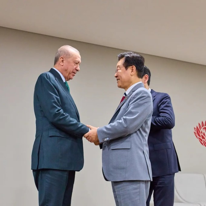 | 이재명 대통령이 22일(현지시간) 남아프리카공화국 주요 20개국(G20) 참석 계기에 믹타( MIKTA) 정상회동을 주재하며 레제프 타이이프 에르도안 대통령과 반갑게 인사하고 있다. [사진=KTV] |