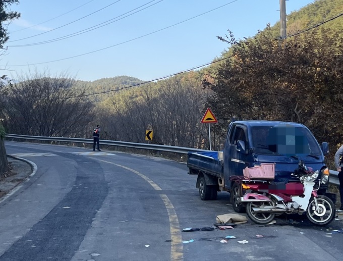 | 23일 오후 3시10분께 경남 산청군 신등면 일대 지방도에서 A(70대)씨가 운전하던 화물차가 마주오던 오토바이와 충돌했다. [사진=독자제공] 2025.11.24 |