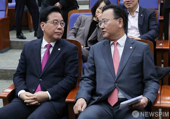 [서울=뉴스핌] 윤창빈 기자 = 송언석 국민의힘 원내대표, 유상범 원내운영수석부대표가 24일 서울 여의도 국회에서 열린 의원총회에서 대화를 하고 있다. 2025.11.24 pangbin@newspim.com