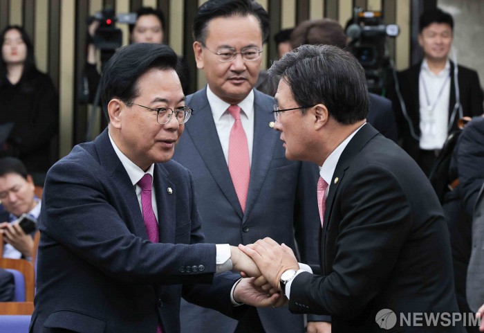 [서울=뉴스핌] 윤창빈 기자 = 송언석 국민의힘 원내대표가 24일 서울 여의도 국회에서 열린 의원총회에서 김대식 의원과 인사를 나누고 있다. 2025.11.24 pangbin@newspim.com
