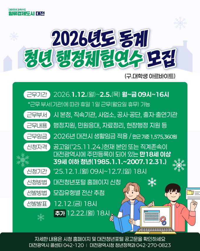 자세한 내용은 대전시청 홈페이지 또는 대전청년포털에 게시된 '2026년도 동계 청년 행정체험연수 모집 공고'를 통해 확인할 수 있다.