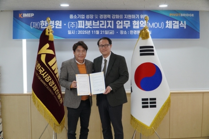 [서울=뉴스핌] 오경진 기자 = 한국시장경제진흥원(이사장 박재천, 이하 '한경원')과 국내 최초 디지털 M&A 플랫폼 기업 피봇브릿지(대표 김태섭)가 11월 21일 중소기업의 성장 촉진과 시장 경쟁력 강화를 공동으로 지원하기 위한 전략적 업무협약(MOU)을 체결했다고 밝혔다.