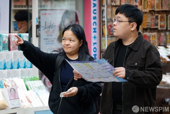 [서울=뉴스핌] 류기찬 기자 = 중국과 일본의 갈등으로 중국 정부가 자국민에게 일본 여행과 유학 등 방문 자제령을 내리면서 한국이 대체 여행지로 각광 받고 있다. 24일 오후 서울 중구 명동거리에서 중국인 관광객들이 이동하고 있다. 2025.11.24 ryuchan0925@newspim.com