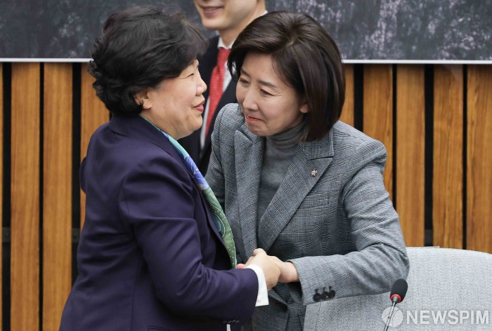 [서울=뉴스핌] 윤창빈 기자 = 나경원 국회 법제사법위원회 국민의힘 의원, 조배숙 의원이 24일 서울 여의도 국회에서 열린 대장동 범죄수익환수 특별법 제정을 위한 긴급 토론회에서 인사를 나누고 있다. 2025.11.24 pangbin@newspim.com
