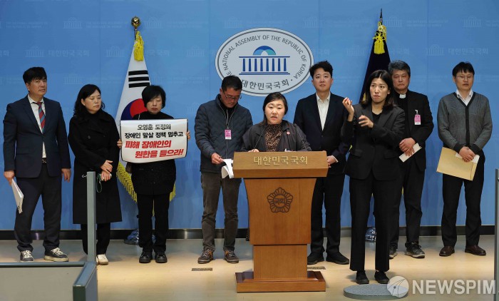 [서울=뉴스핌] 윤창빈 기자 = 이준석 개혁신당 대표가 24일 서울 여의도 국회에서 중증장애인시설인 사랑의집과 관련 피해자 및 관계자들과 함께 기자회견을 하고 있다.2025.11.24 pangbin@newspim.com