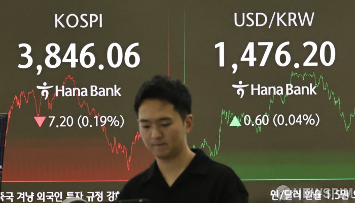 [서울=뉴스핌] 양윤모 기자 = 24일 오후 코스피가 전장 종가보다 7.20 포인트(0.19%) 하락하며 3846.06으로, 코스닥은 7.51 포인트(0.87%) 하락한 856.44로 장을 마감한 가운데, 서울 중구 하나은행 딜링룸에서 직원들이 업무를 보고 있다. 서울외환시장에서 달러/원 환율은 전장 대비 0.60원 상승한 1476.20원에 주간거래를 마감했다. 2025.11.24 yym58@newspim.com