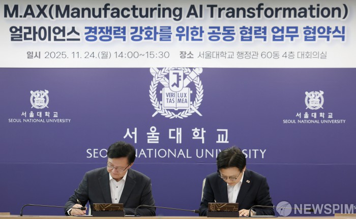 [서울=뉴스핌] 김정관 산업통상부 장관과 유홍림 서울대학교 총장이 24일 서울 관악구 서울대학교에서 열린 산업부-서울대 간 M.AX 얼라이언스 협력을 위한 MOU 체결식에서 협약서에 서명을 하고 있다. [사진=산업통상부] 2025.11.24 photo@newspim.com