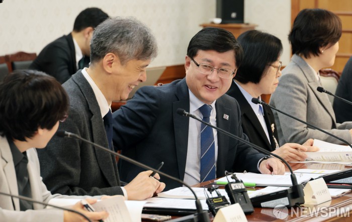 [서울=뉴스핌] 이길동 기자 = 김성환 기후에너지환경부 장관이 25일 서울 종로구 정부서울청사에서 열린 제17차 미세먼지특별대책위원회 회의에서 이강웅 민간위원장(왼쪽두번째)과 대화를 하고 있다. 2025.11.25 gdlee@newspim.com